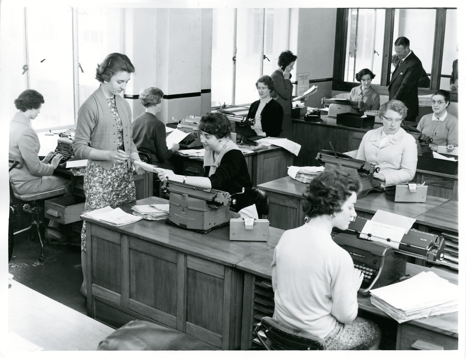 New Zealand Railways. (1959). Head Office typists room, New Zealand Railways, 1959 [Photograph]. Wikimedia Commons. https://commons.wikimedia.org/wiki/File:Head_Office_typists_room,_New_Zealand_Railways,_1959_(25557790294).jpg